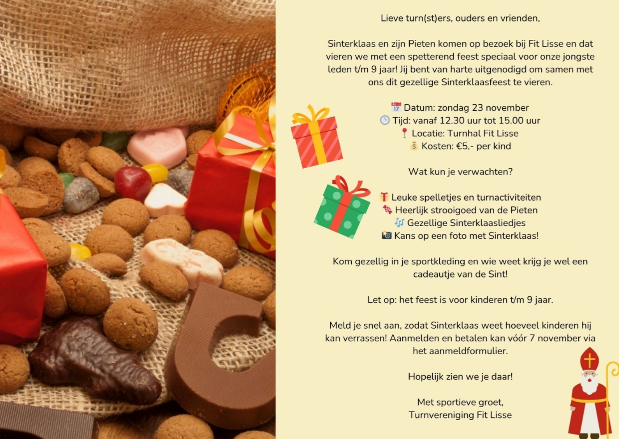 Lieve turnsters en turners, De Sint komt weer langs bij Fit en we vieren dat op zondag 23 november. Ben je niet ouder dan 9 jaar …